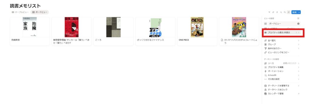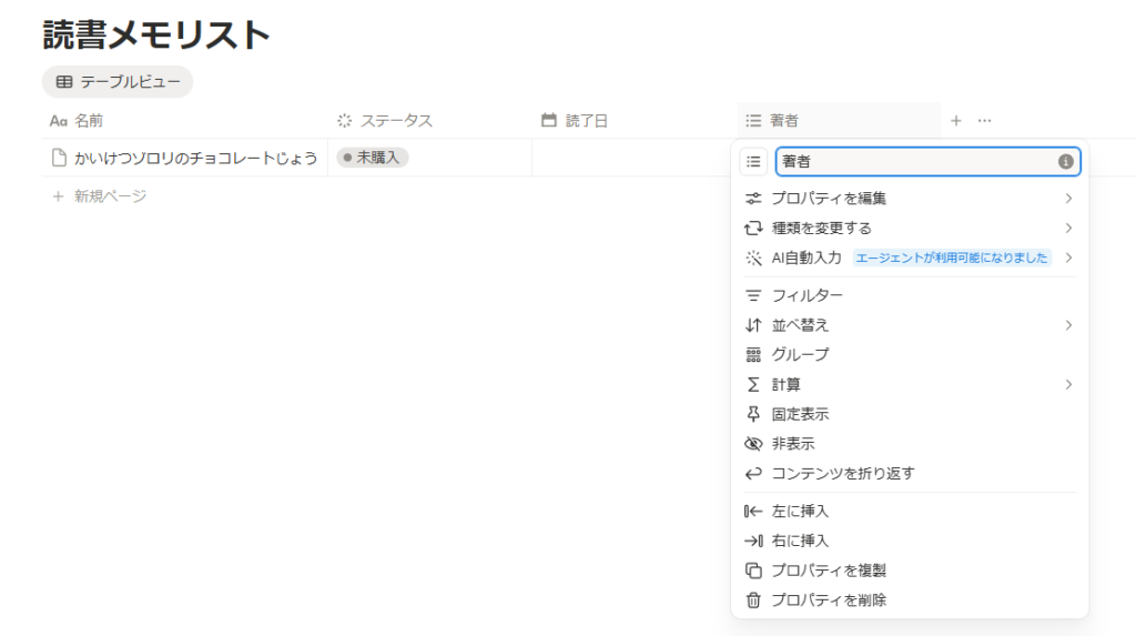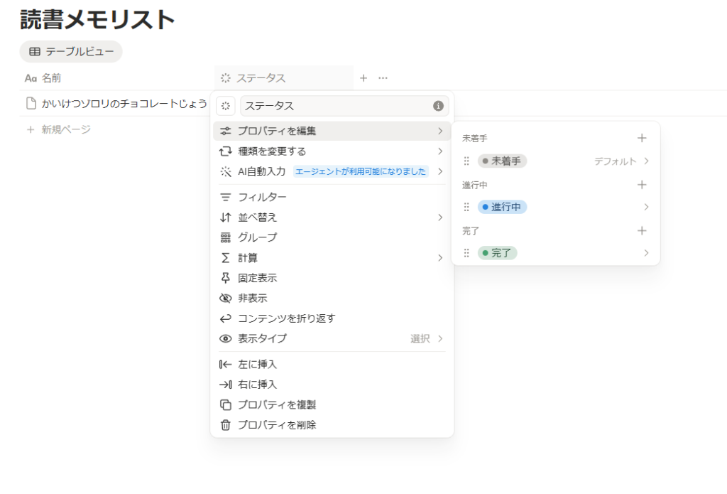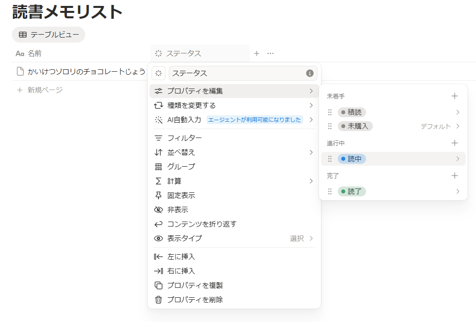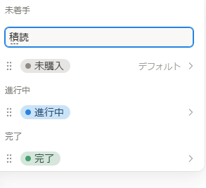 さらにステータスをクリックし、「プロパティを編集」にカーソルを合わせて、ステータスの各項目の名前を未購入、積読、読中、読了に編集しちゃいましょう