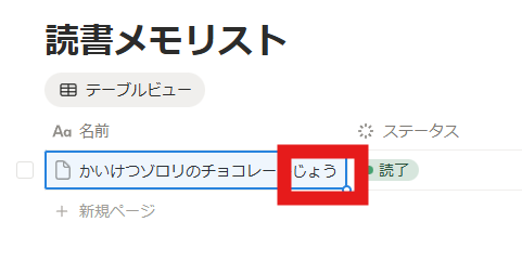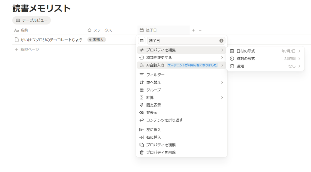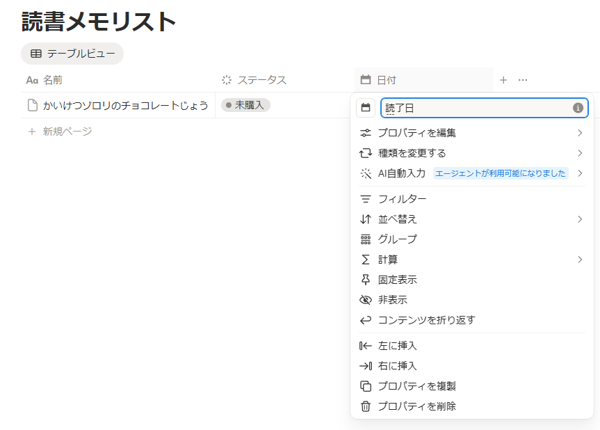 作成された「日付」をクリックして「読了日」に変更、