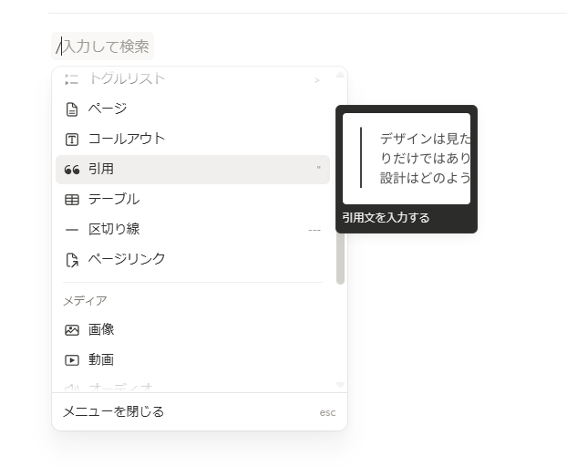 ちなみに「/」と入力した後にでるページをスクロールすると「引用」があるので、読書メモをつける時に役立ててください!