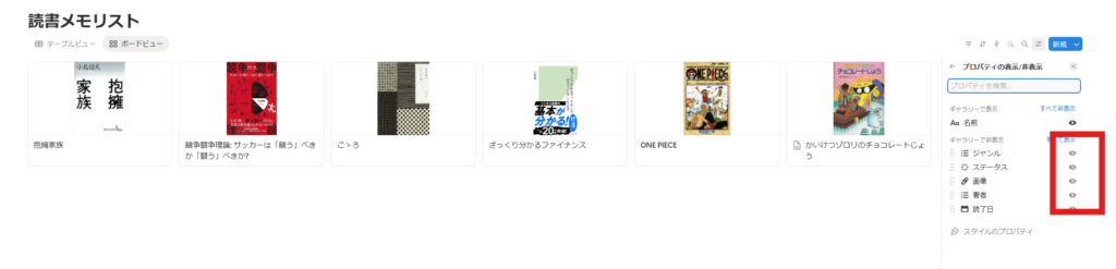 そうしたら表示させたい項目、今回は「ステータス」と「ジャンル」の横にある目のマークをクリックして「表示」に切り替えましょう!
